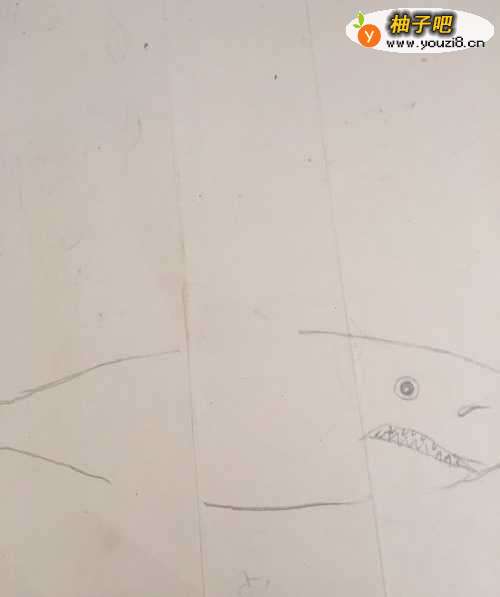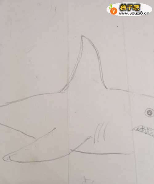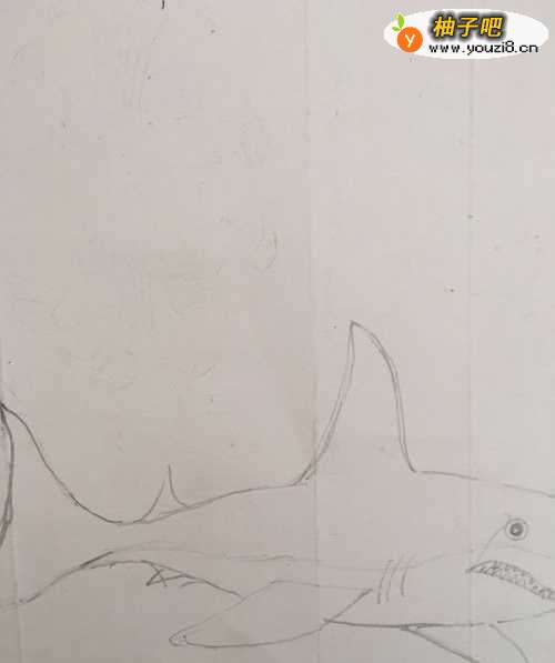 3第三步 再画上鲨鱼的身子轮廓 把鲨鱼翅的部位留出来 以免还得用橡皮擦