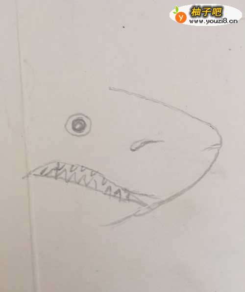 2第二步 再画上鲨鱼的头部 眼睛 嘴巴 牙齿