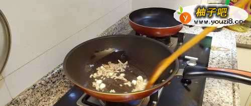 3油热后,加入蒜子和肉丝,小火煸炒至出油。