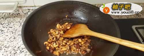 4加入香菇丁,加入少许生抽,翻炒出香味。