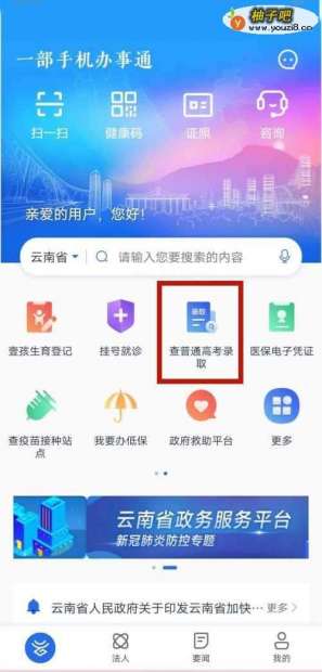 手机打开云南办事通软件,输入考生信息,查询高考录取等状态详情。