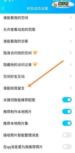 5点击打开好友动态权限设置,找到谁能给我留言。