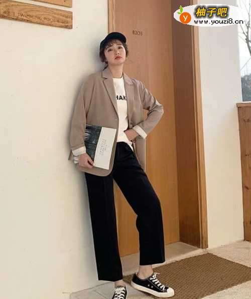 搭配一:奶咖色雪纺西装外套西装外套是今年很热门的单品,奶咖色雪纺西装外套搭配黑色阔腿裤穿出来特别帅气。