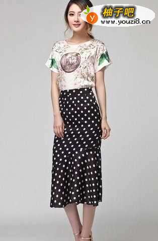4你看,女人味在这里,鱼尾裙的曲线取决于臀部曲线的完美,这是好身材的一种表现。黑白波点,又是一次拼色的奇异之旅,不断尝试新的表达方式是设计师们的心理游戏,印花短袖T恤,总有些故事呈现在无意之间。