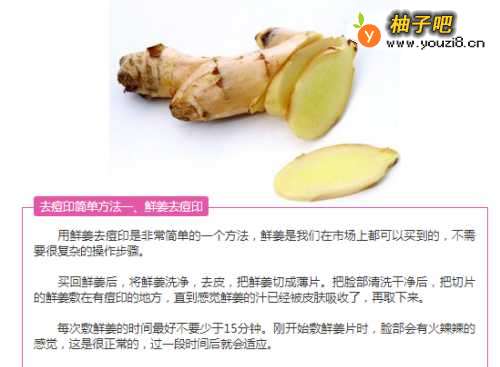 祛痘印第一种方法是用生姜片敷脸。将生姜切成片敷在痘印处15分钟后取走。反复一段时间即可发现痘印慢慢变淡。