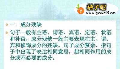 病句辨析题是高考第三大板块“语言知识运用”的一个重要板块。所谓“病句”是指不符合现代汉语语法规则,不合逻辑手里的句子,即在与语法或逻辑上有毛病的句子。它是历年来高考考查的重点,也是难点。在现代汉语中,各种句子成分都有一定的结构规律,如果句子某种成分应该有,而句子却没有,句子结构不完整,或者句子句子结构已经完整,句意已经明确,而又多出了一些不必要的词语,句子的修饰语包括定语、状语、补语等附加成分,这些成分残缺,有时就会造成句子修饰语残缺的语病。