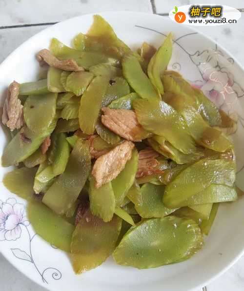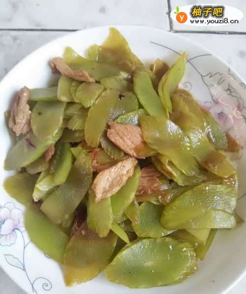 11将青笋和肉片翻炒均匀、炒熟,就可以出锅了。