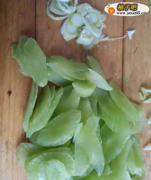 3用刀将青笋切成均匀的薄片,将葱也切成薄片。