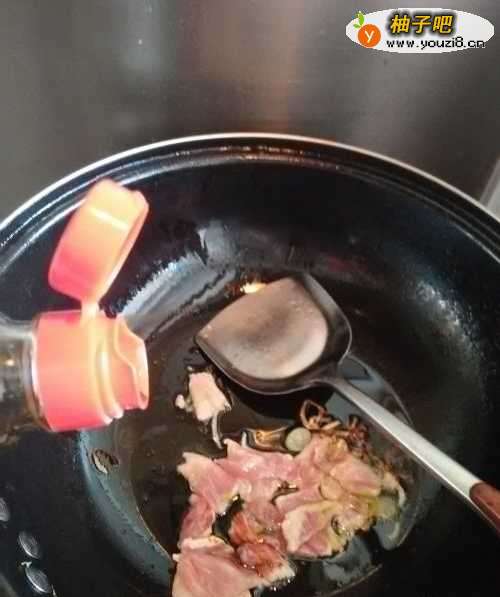7在锅中倒入少许酱油,使肉片的味道更香。