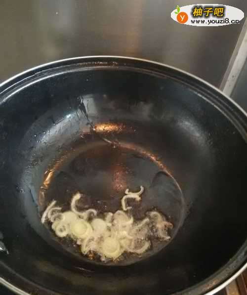 5锅烧热后,先倒入食用油,再放入葱丝炝出香味。