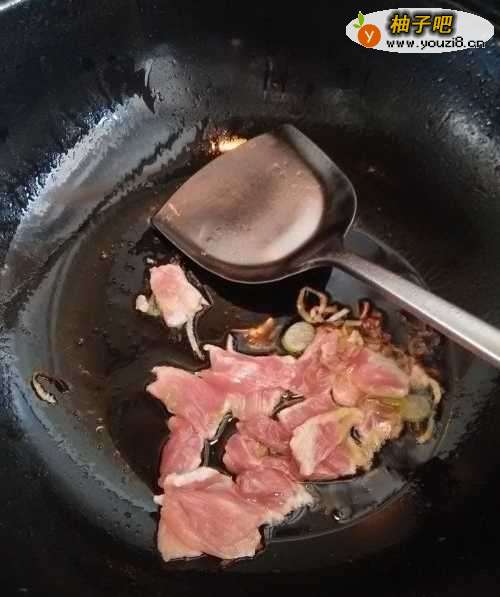 8用铲子快速煸炒肉片,使肉片不糊锅底。