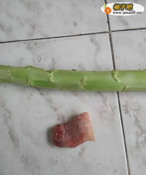 先将青笋的叶子去掉,再准备一块猪肉和一根葱。