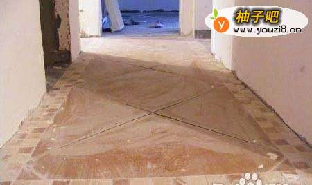 4客厅如涉及到斜拼对花的工艺,注意装饰花的尺寸,通常会借用卡子的作用,以保证瓷砖缝隙均匀,才能很完美的安装装饰花。如下图所示,瓷砖缝隙均为3mm,才能安装下装饰花。