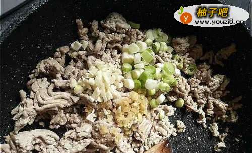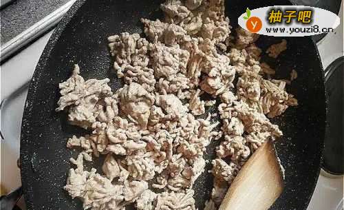 平底锅放油,油热了放入绞肉,将绞肉煎香