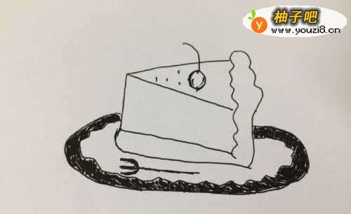 6把蛋糕上面画出一颗樱桃,再把蛋糕中间画两条线。这样好吃的蛋糕就画好了。