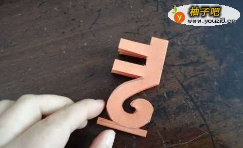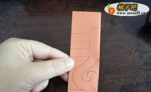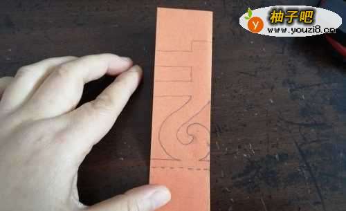 3我们在把彩纸回口向左,在纸上画上要剪的图案,下面的部份沿虚线向后折。