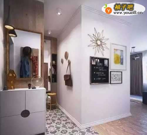首先是玄关,玄关的面积很小,放了一个鞋柜,还有衣帽架,还在墙面做了圆形的扣子,可以挂一些包包,小小的玄关也布置的这么精致。