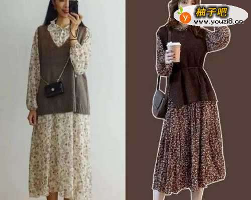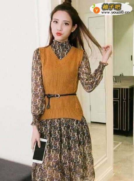 5橘色束腰针织马甲内搭碎花连衣裙,不但有很好的显瘦效果,同时更能够给人一种俏皮可爱的青春范。
