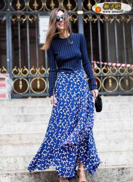 2蓝色修身套头针织衫搭配蓝色碎花连衣长裙,不但能很好的彰显出个人知性优雅的气质,同时这种穿搭方式又能够给人一种很高级的感觉。