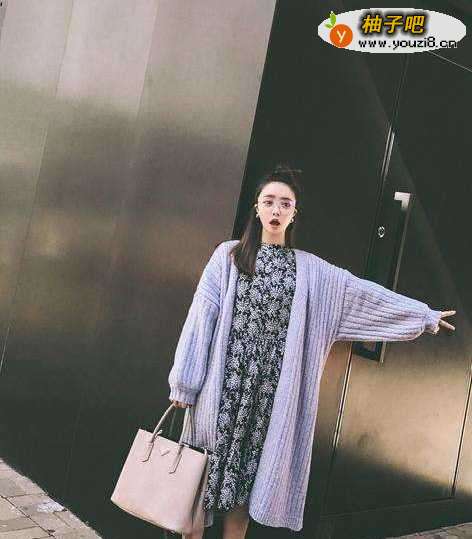 3紫色长款开衫针织内搭碎花连衣长裙,非常具有名媛范的穿搭方式,不但有很好的减龄效果,同时又非常具有独特性。