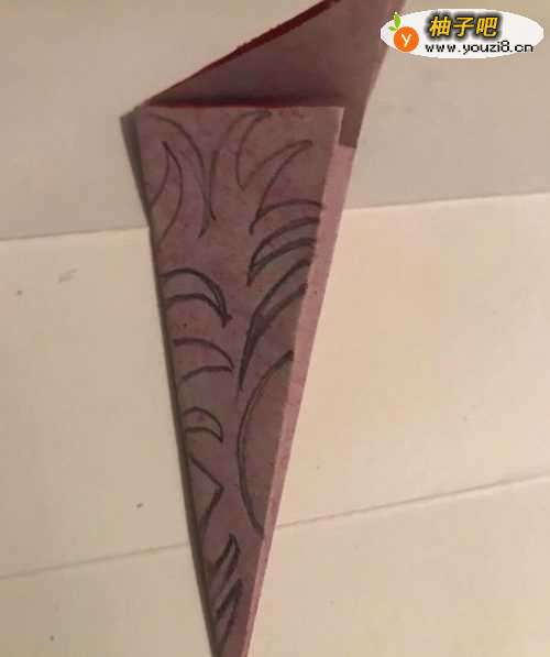 4第四步 向下折完一道折痕之后 拿起绘图铅笔画上凤尾纹样 再画上其它陪衬小图案等等