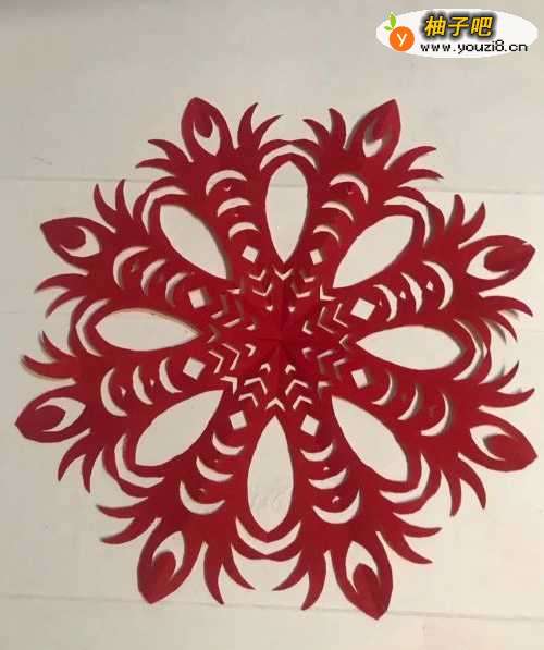 6第六步 剪完外围多余的彩纸之后 再剪里面的细节部分和镂空部分 还有其它涂实的地方等等 全部剪完之后 再把它展开压平 一副美观漂亮的凤尾窗花就剪完了