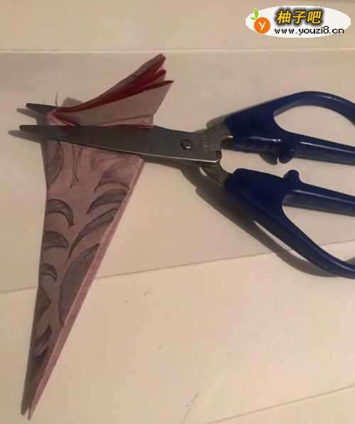 5第五步 都画完之后 拿起手工剪刀开始裁剪 首先把大头处多余的彩纸大体上剪去一部分
