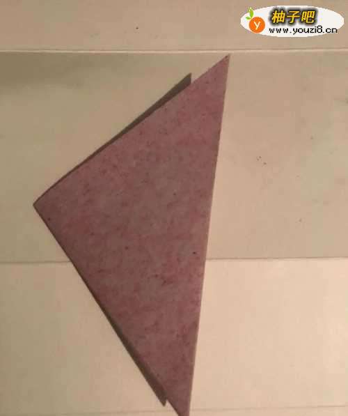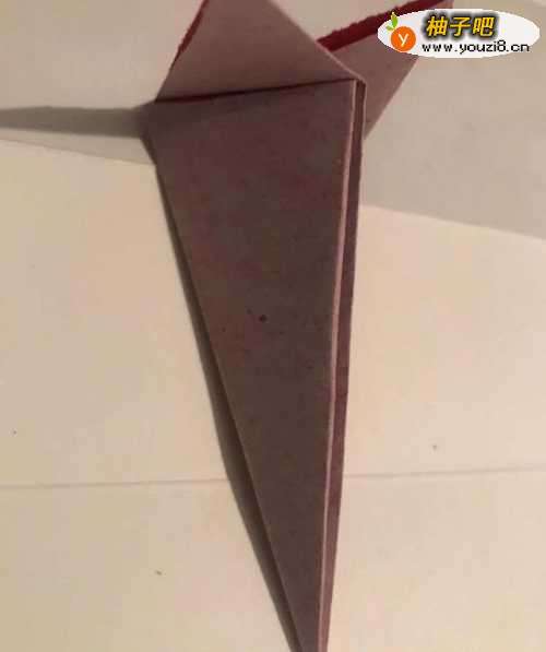 3第三步 左下角与右上角对折好之后 再从左向右对折一次(共四次) 然后再把上头(即大头)多出来的彩纸向下折叠一道折痕