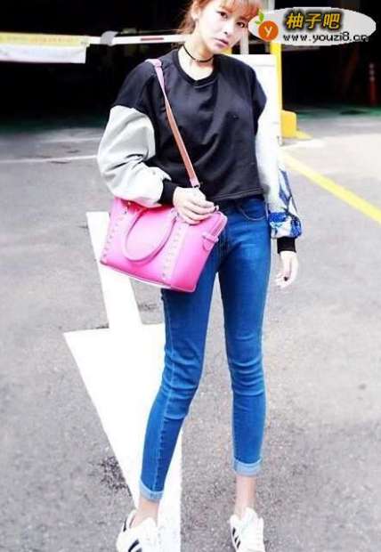 宽松亮片袖子卫衣 + 紧身牛仔裤+ 彩色背包