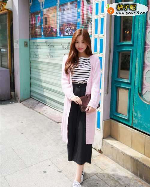 6甜美清新粉色长款毛衣外套+条纹内搭+黑色阔腿裤