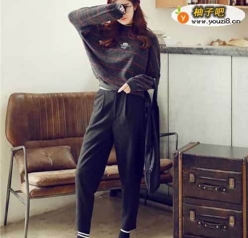 3细条纹刺绣毛衣+黑色小脚哈伦裤