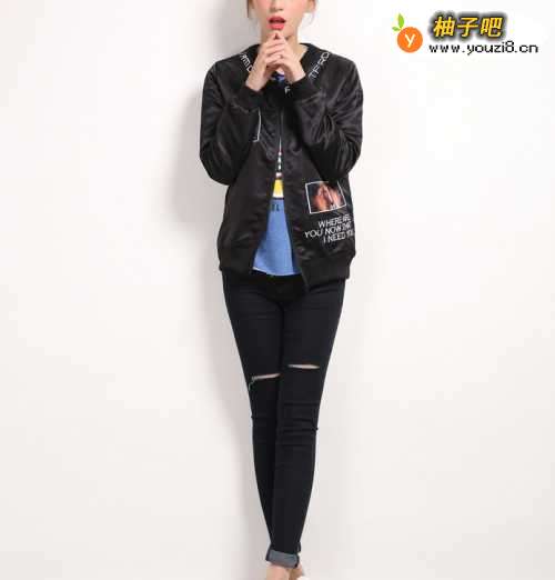 4彩色卡通卫衣+黑色棒球服外套+黑色破洞小脚裤