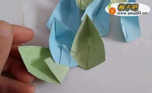 5我们从中间打开把一侧的角向内折,如图二。把其他的彩纸按照上边的步骤一样操作完成,如图三。