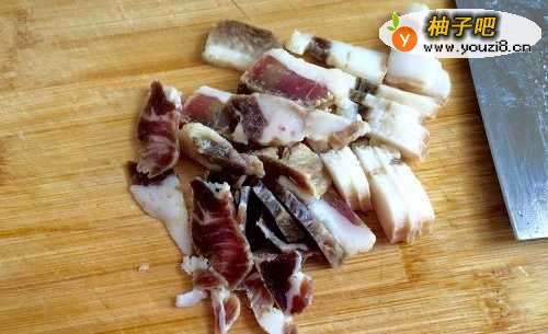 首先将腊肉放在温水里面泡大约20分钟,然后沥干切成薄片即可。胡萝卜也去皮切成丝备用。