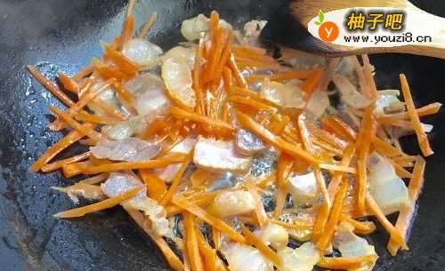 4待腊肉的油脂全部被煸出来之后,肉就会呈现出粉色的或者透明状的,这时候就可以下胡萝卜丝了。