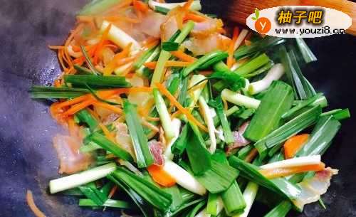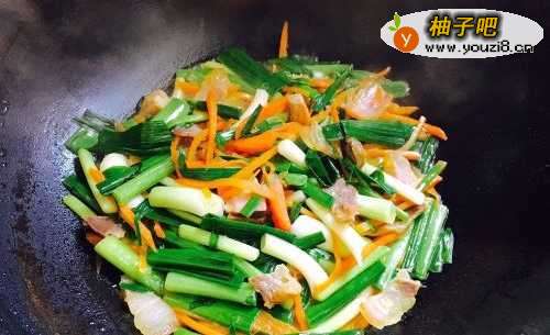 5把胡萝卜丝稍微翻炒一下,待萝卜丝全部被油裹了一遍就可以吧青蒜段倒进去翻炒。