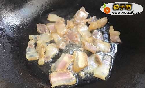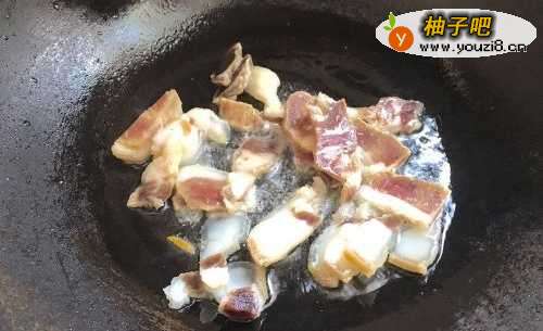 3所有的原材料都准备齐全之后就可以开火,锅烧热之后,放入少许油,油热之后先把腊肉放进去煸炒。