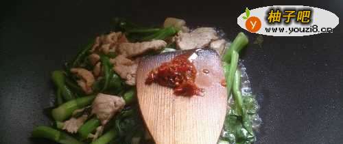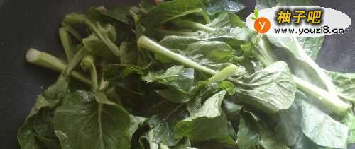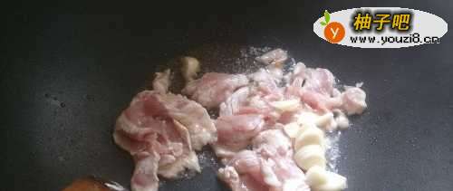 5第五步:等油热得翻滚的时候把猪肉放入煸炒(一定要等油热否则猪肉的质感和口感控制不了),加入少许大蒜和生抽盐之类的调味品,煸炒到发黄就可以把菜心放进去了。