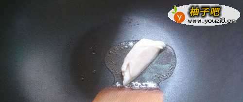 4第四步:在热锅里加入油(这次我们用的是猪油,个人感觉猪油相对调和油口感较好,也很多人说猪油胆固醇高),看个人喜好而去,家常菜一般没什么特别要求。