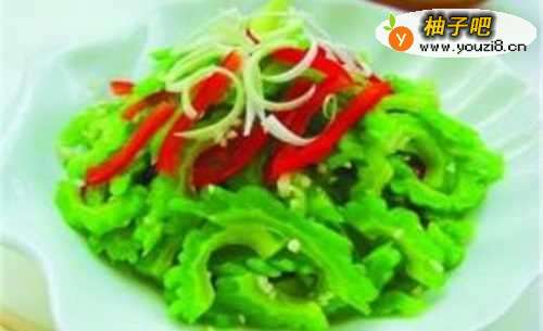 选择翠绿、肥厚的苦瓜,清洗干净、清楚瓜瓤、切成片状,然后下开水焯一下,之后用凉水冲洗,加入盐、生抽、醋、香油调匀即可。