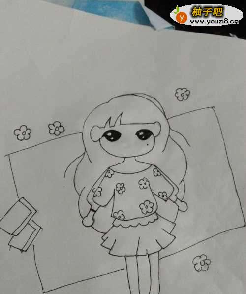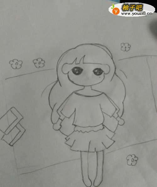 5然后我们继续画的是萌小希躺在的床上的床,床上放了些东西注意(床上的东西不要太多,太多可能会显得很乱),还有一些小花作为装饰品。注意小花的位置可适当分散还要注意大小。
