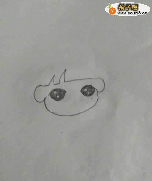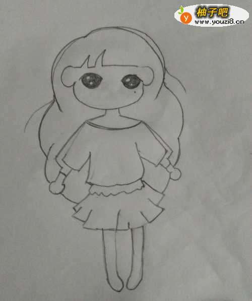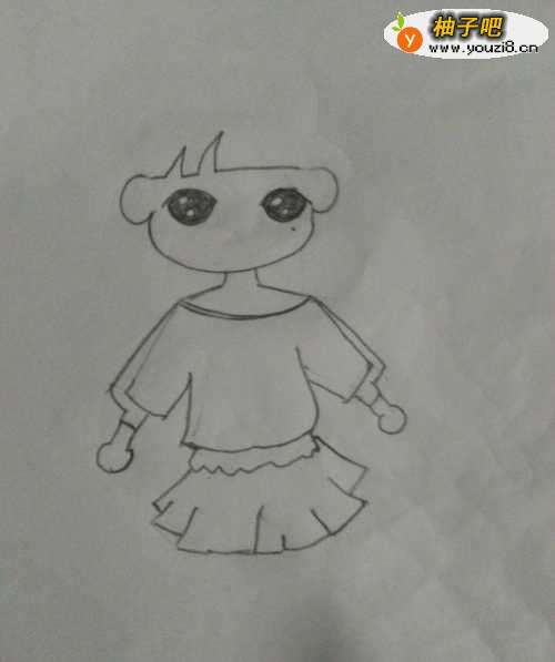 2下一步我们接着画萌小希的萌动人心的大眼睛。眼睛内部我们要留出高光注意两只眼睛的大小距离一定要对称。然后我们把萌小希的上衣画出来,她的上衣下摆是直接连接到下面的裙子的所以注意一下。