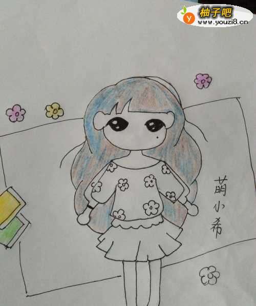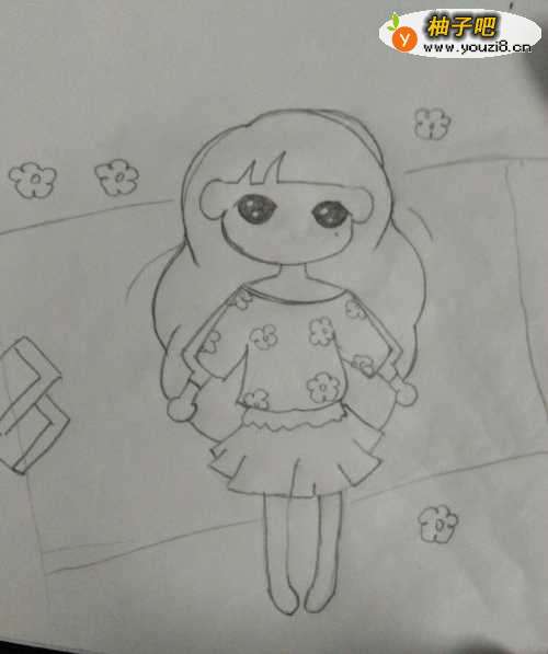 6接着我们把萌小希的衣服上也画上些小的花朵作为点缀。衣服上的花朵就不要画的太多了,有一朵两朵做点缀就好。