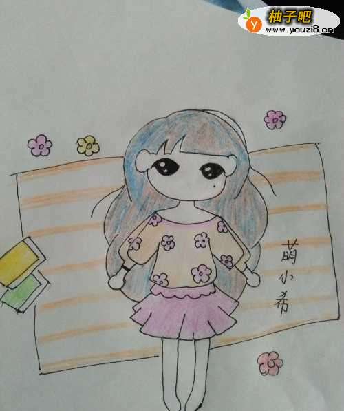 8最后我们开始上色,萌小希的头发我给上了两种颜色。亲们可以随自己的意上自己喜欢的颜色。我们把身下的床单也涂上条纹。颜色我们可以自己选择。但注意选用的颜色最好是一个色系的这样不会显得很突兀。