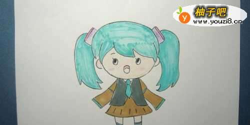 接着, 用彩色笔给初音的头发和衣服涂上颜色,注意要涂的均匀些,颜色搭配要好看些,如下图所示。