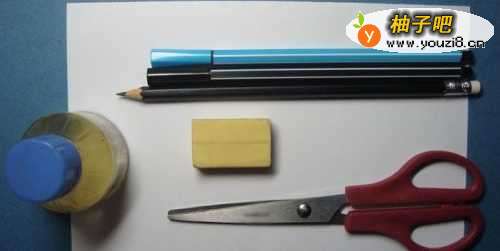 需要准备好用纸做出初音的工具和材料,有白纸、铅笔、橡皮、彩色笔、剪刀等,如下图所示。