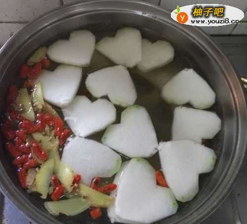 6将心形冬瓜片放入锅中,转中火继续煮。