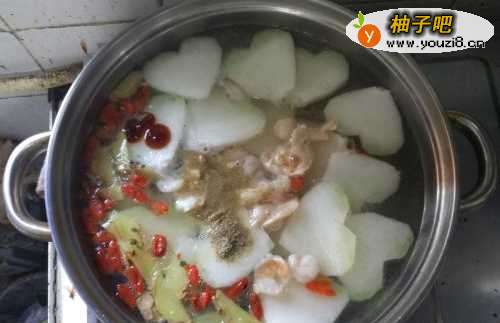 8加入盐、蚝油、白胡椒继续煮至虾仁变红,冬瓜熟就可以端上开喝了。