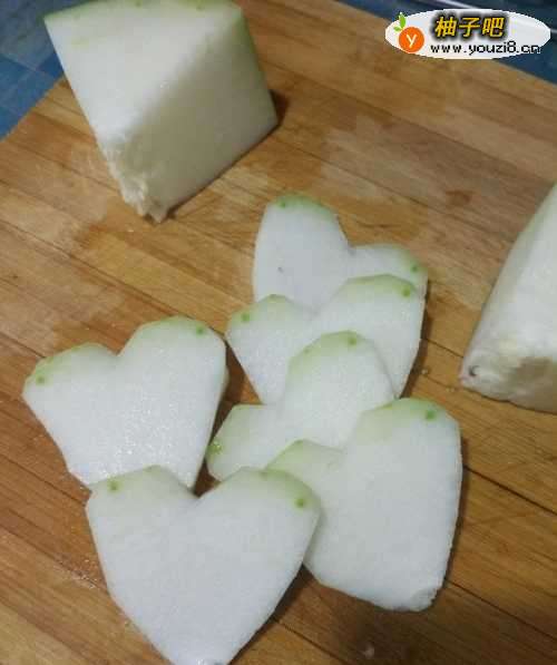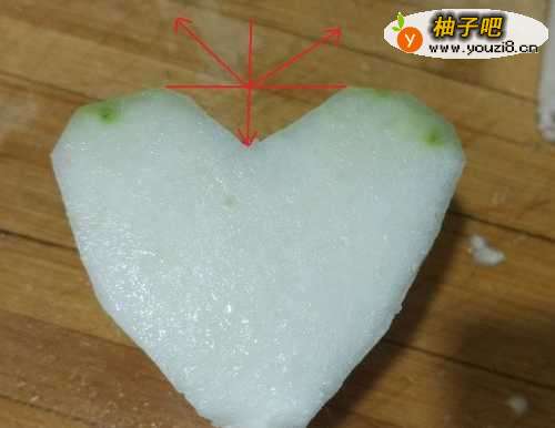 4平刀将心形冬瓜段切成厚片,心型冬瓜片就制作完成了。