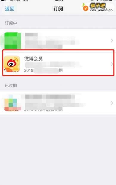 5点击后,在订阅主页下就可以看到目前的续费会员订阅信息。我们要取消微博的续费会员订阅,就点击微博一栏,如图所示!